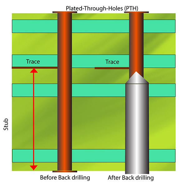 La retroforatura dei circuiti stampatiè un processo di produzione utilizzato per i PCB multistrato. Il suo scopo principale è quello di rimuovere il rame in eccesso all’interno dei vias nelle tracce di segnale ad alta velocità, migliorando così l’integrità del segnale e riducendo la diafonia e le riflessioni.